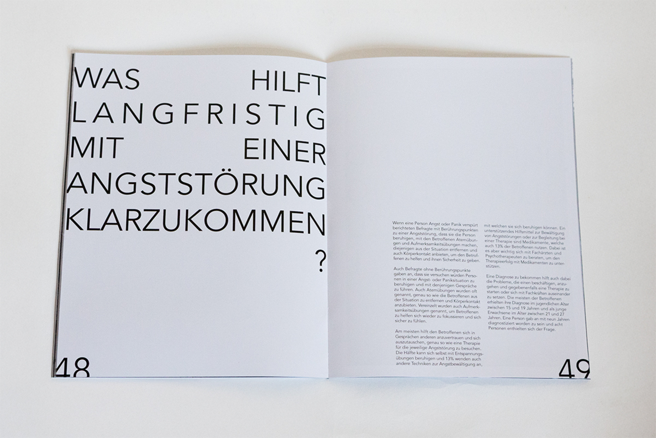 Hier wird die psychische Erkrankung der Angststörung in den Vordergrund gerückt, um zu visualisieren wie eine betroffene Person ihre Umwelt im Moment der Panik wahrnimmt. In einem Fotobuch wird dieser Zustand durch künstlerische Fotografien dargestellt, bei welchen Stilmittel wie Bewegungsunschärfe und Verzerrung eingesetzt wurden. Gleichzeitig werden im Kontrast auch Fotografien der Umwelt eingearbeitet, wie es für Personen ohne eine Angststörung wirkt.