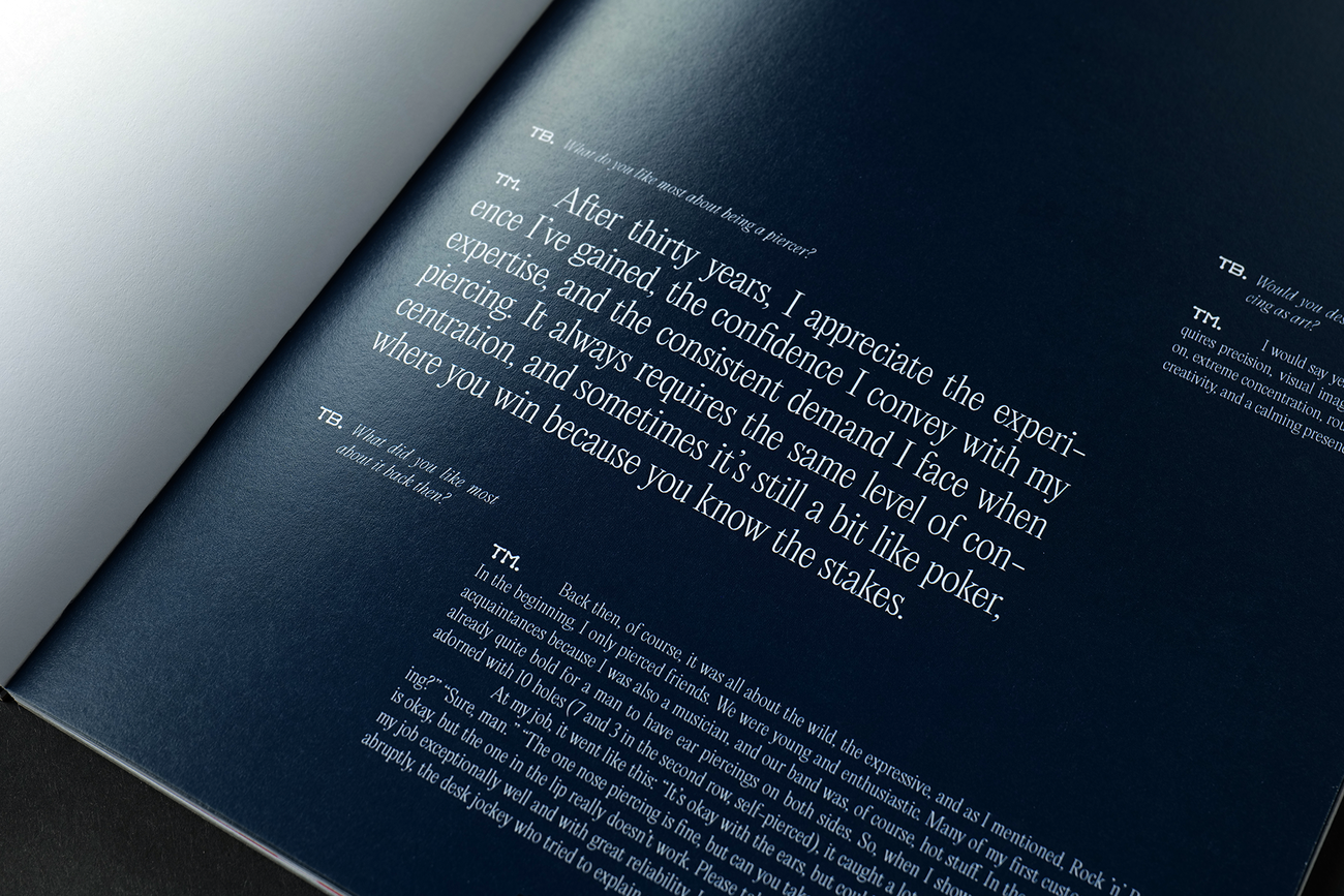 Mein Buch handelt von der Geschichte eines Piercers, seiner Vergangenheit und seinem Leben. Die Welt des Punk, Piercings und einer Leidenschaft wird anhand alter Fotos und Materialien präsentiert, die aus der Vergangenheit gesammelt wurden. Im Gegensatz dazu stehen das Piercing-Studio und Thomas von heute. Was hat sich verändert?