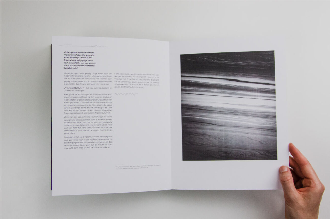 Im Buch finden unsere intensive inhaltliche Auseinandersetzung mit dem Thema in textlicher Form sowie eine Vielzahl der entstandenen Bilder zusammen. Gestalterische Besonderheiten, wie zum Beispiel Cutouts oder Fragmentierung der Titel, lassen das Thema zusätzlich lebendig werden. Wir entführen in das verborgene Reich der Träume und wollen dazu anregen, sich selbst mehr mit den eigenen Träumen auseinanderzusetzen.