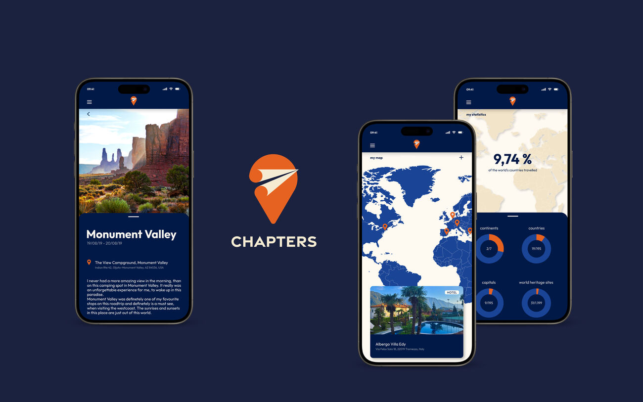 Mit meiner App "Chapters" hat man die Möglichkeit alle Reisen, Reiserouten, Fotos und Locations abzuspeichern und in digitaler, kompakter Form bei sich zu haben. Es gibt eine Karte um bereits bereiste Länder zu markieren, eine Übersicht über die eingetragenen Reisen und Reisestatistiken, aber auch eine einfache Bucketlist und eine digitale Sticker-Collection.
