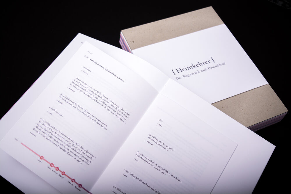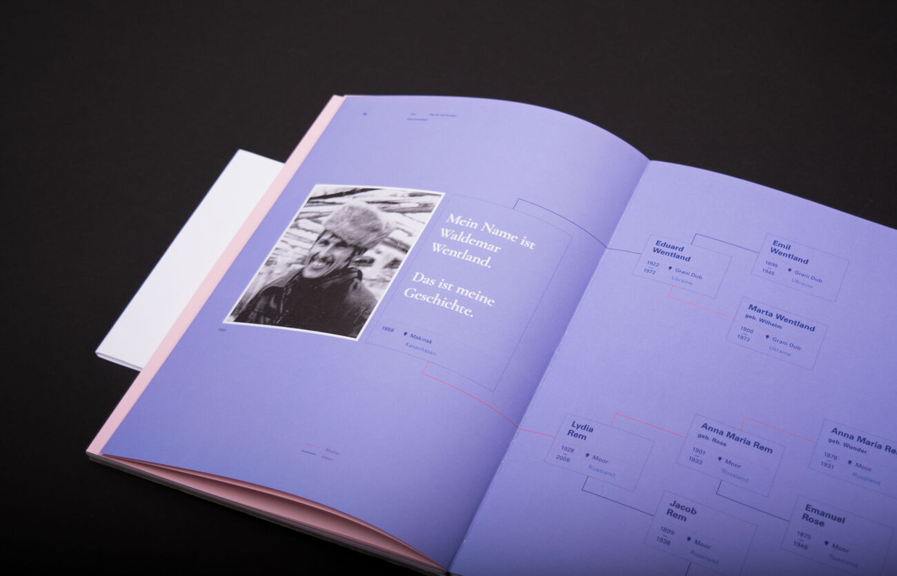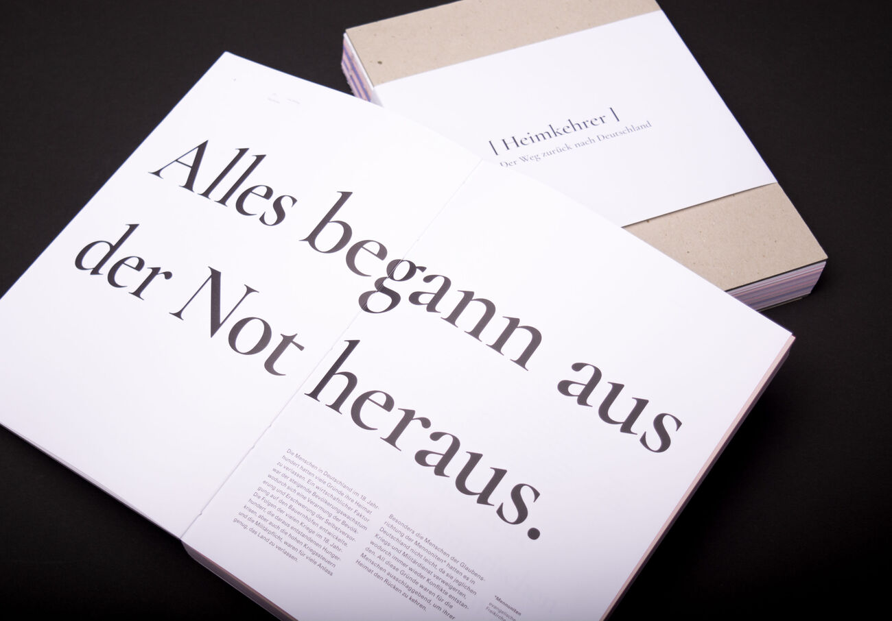 In Deutschland leben derzeit um die 2.500.000 Menschen, die mit der Aussiedlungswelle in den 90er Jahren aus der ehenmaligen UdSSR zurück nach Deutschland ausgesiedelt sind, die sogenannten Russlanddeutschen. Meine Familie und ich gehören auch zu diesem, doch nicht so kleinen Teil der deutschen Bevölkerung. Viele Menschen in Deutschland halten Russlanddeutsche für Russen oder Ausländer. Deshalb habe ich mich mit der Lebensgeschichte meiner Mutter und meines Vaters befasst. Die Dokumentation über meine Eltern setzt sich aus Bildern, Texten, Dokumenten und Anekdoten zusammen. Doch um überhaupt ihre Lebenserfahrung zu verstehen zu können, habe ich die Geschichte der Aussiedlung der Deutschen nach Russland und ihren Weg zurück in die Heimat verständlich zusammengefasst und visualisiert. Für Russlanddeutsche ist das Thema Heimat immer stark präsent, weshalb ich mich mit dem Gefühl „Heimat“ in Form einer Umfrage beschäftigt habe.