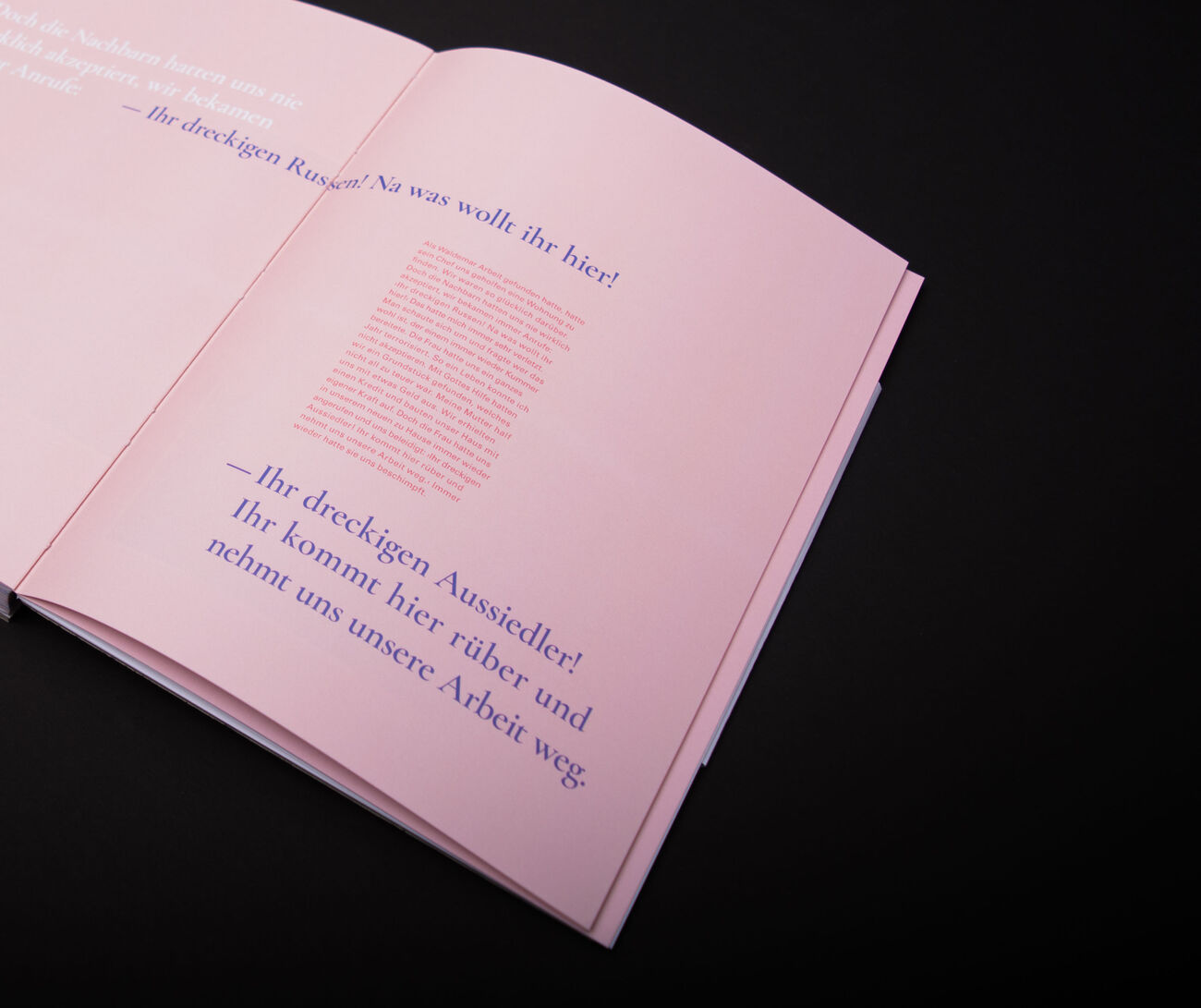 Das Buch ist vom Beginn der Ausreise nach Russland bis heute chronologisch aufgebaut. Die Geschichte der Russlanddeutschen, meiner Mutter und meines Vaters sind zeitlich klar abgestimmt und visuell durch unterschiedliche Seitenfarben getrennt.