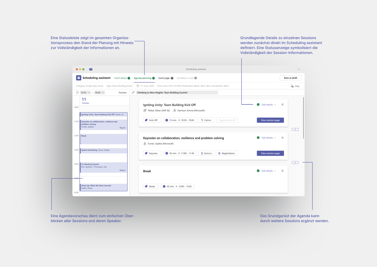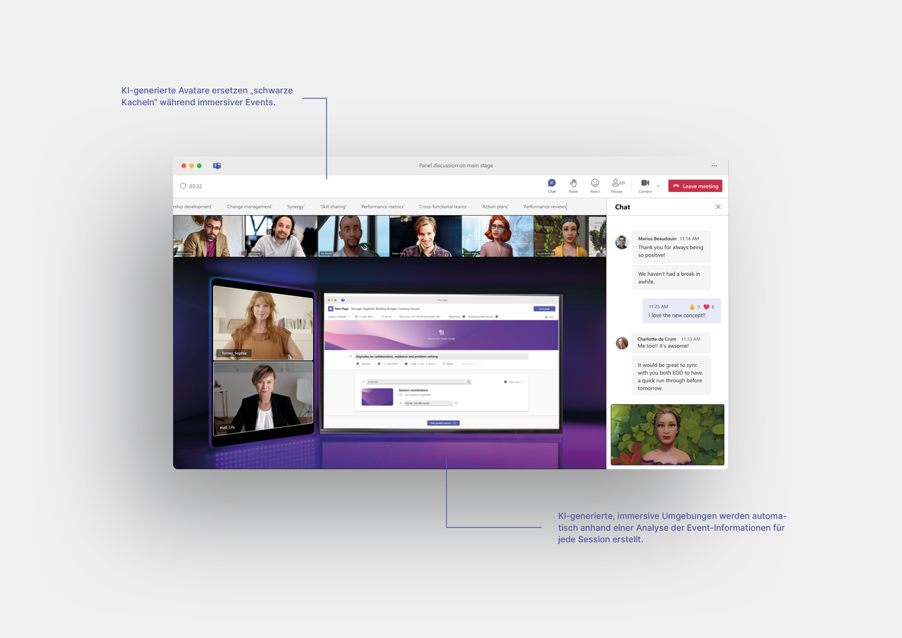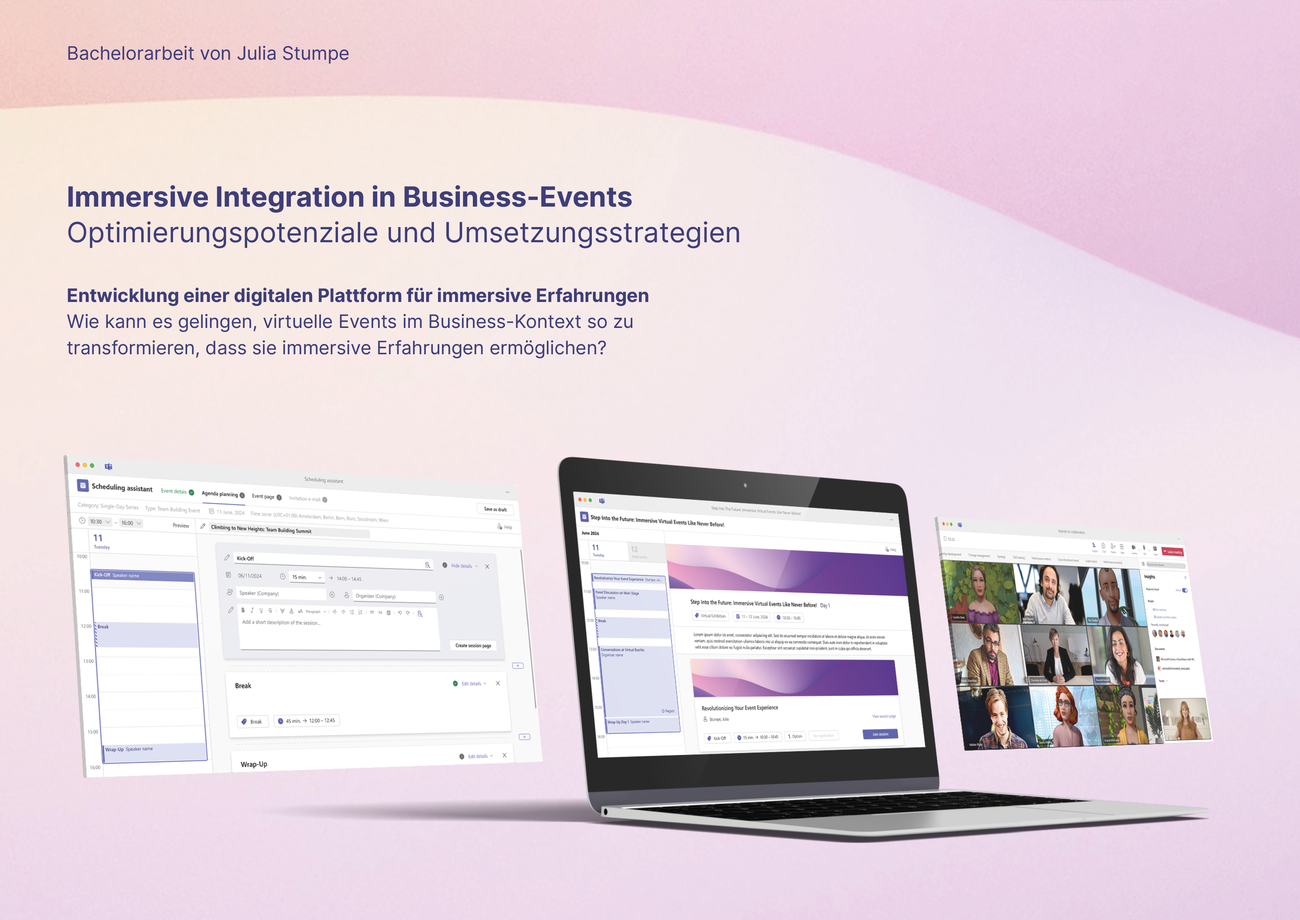 Das Ergebnis: ein innovativer Prototyp einer digitalen Plattform für virtuelle Events im Business-Kontext. Diese Plattform basiert auf der bewährten Meeting-Plattform Microsoft Teams und integriert bekannte semiotische Strategien, um eine intuitive und nahtlose Integration in den Arbeitsalltag zu gewährleisten. Sie wurde mit dem Ziel entwickelt, den gesamten Eventprozess – vom Planungsprozess über die Durchführung bis hin zur Nachbereitung – aus der Perspektive der Teilnehmer:innen und Veranstalter:innen auf ein völlig neues Level zu heben.