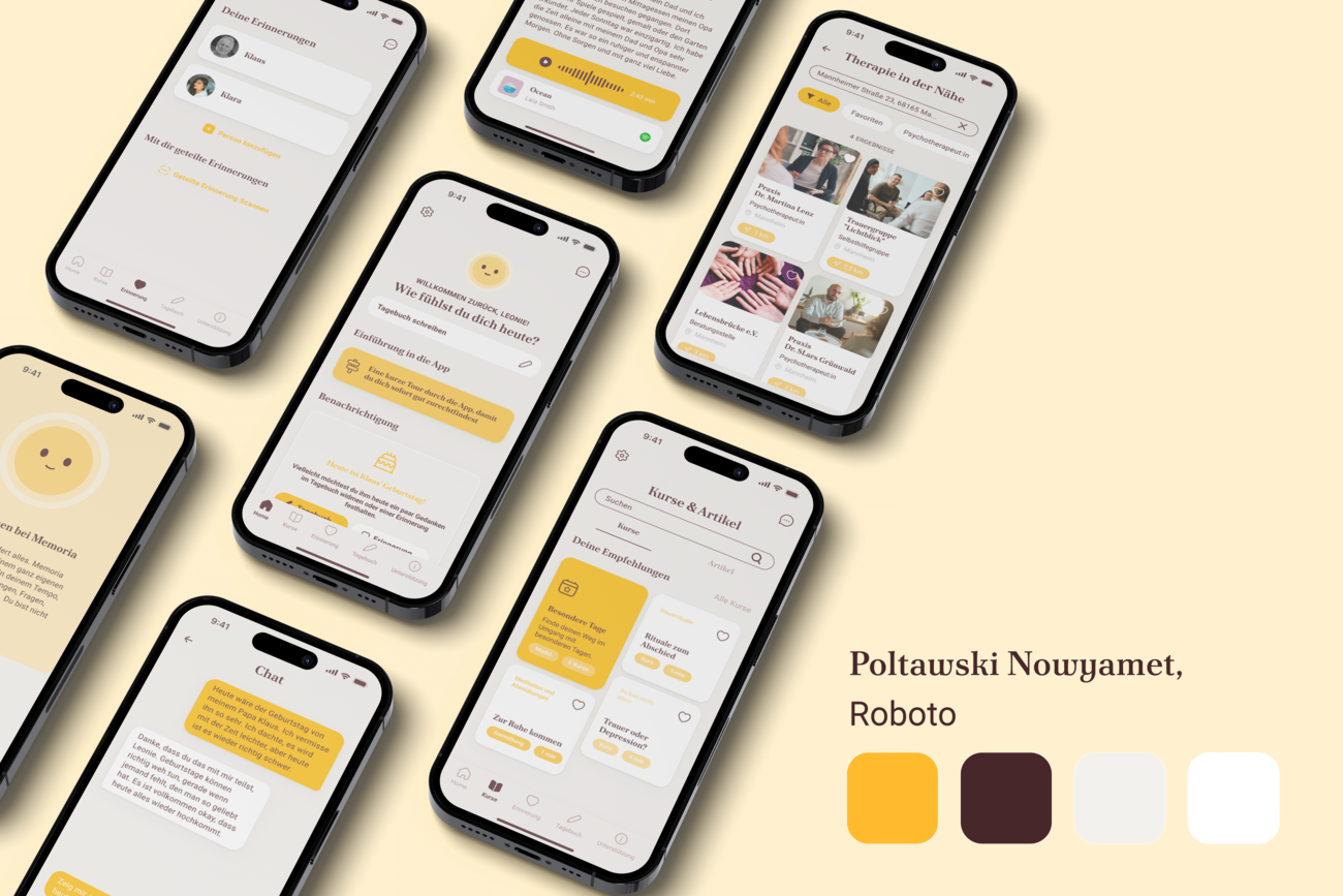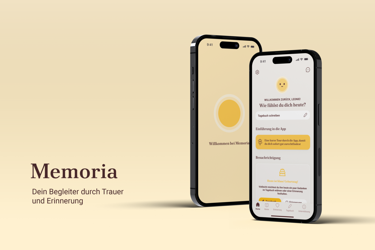 Meine Masterarbeit setzt genau hier an: Die App ‚Memoria’ wurde als einfühlsamer Begleiter konzipiert, der wie ein Freund an der Seite Trauernder steht, zuhört und durch den Trauerprozess führt. Eine zentrale Funktion ist die persönliche Erinnerungssammlung, in der alle Fotos, Videos, Texten, Songs oder Orte an einem Ort festgehalten werden können. Ergänzend bietet die App Kurse zur Trauerbewältigung, wissenswerte Artikel über Trauer, Tod und Beerdigung, eine Tagebuch zur Reflexion sowie den Austausch mit einem digitalen KI-Buddy. Darüber hinaus können Betroffene über die Anwendung auch den Zugang zu professioneller Unterstützung finden.