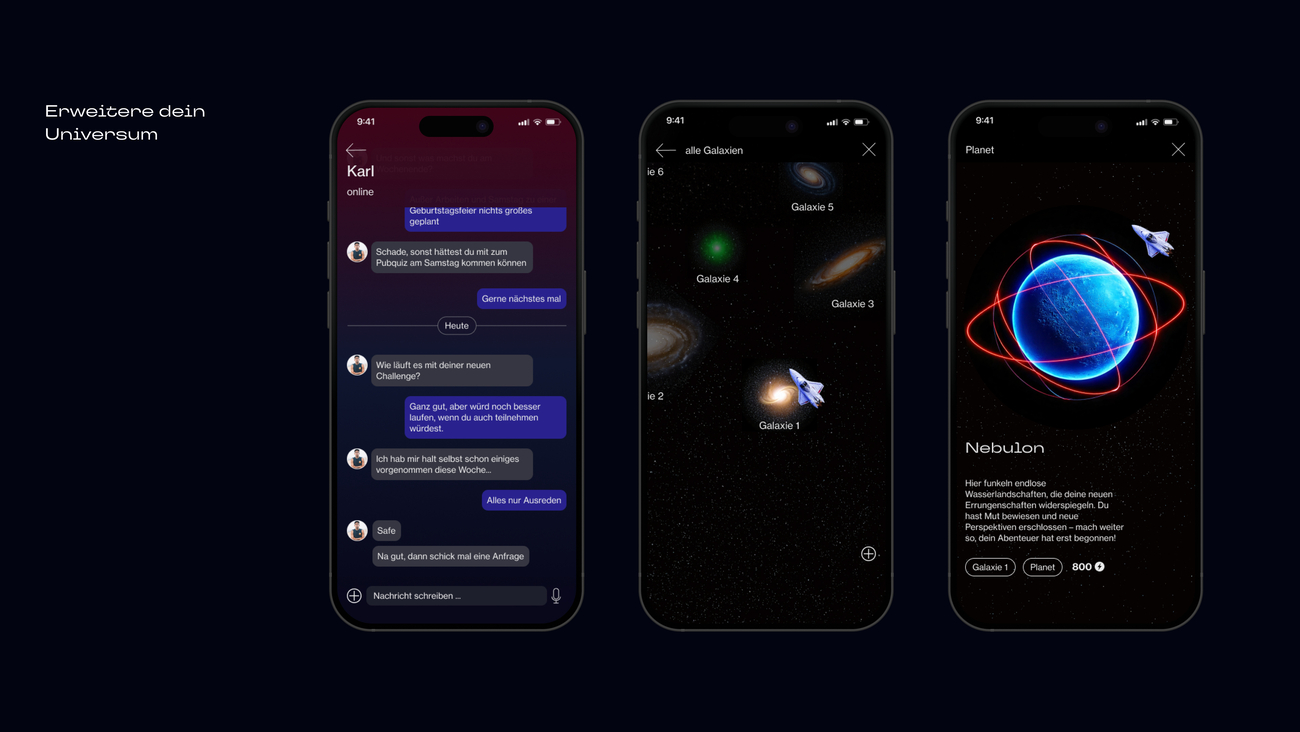 Das Abschließen von Challenges wird belohnt – der Nutzer kann Treibstoff sammeln und damit sein persönliches Universum erkunden und erweitern. Auch das Teilen von Herausforderungen mit anderen Usern motiviert und schafft ein unterstützendes Umfeld..