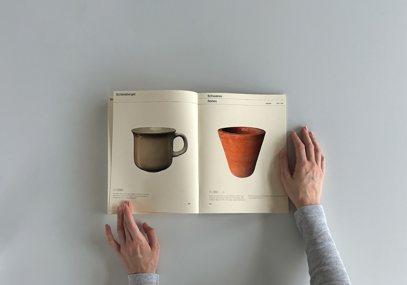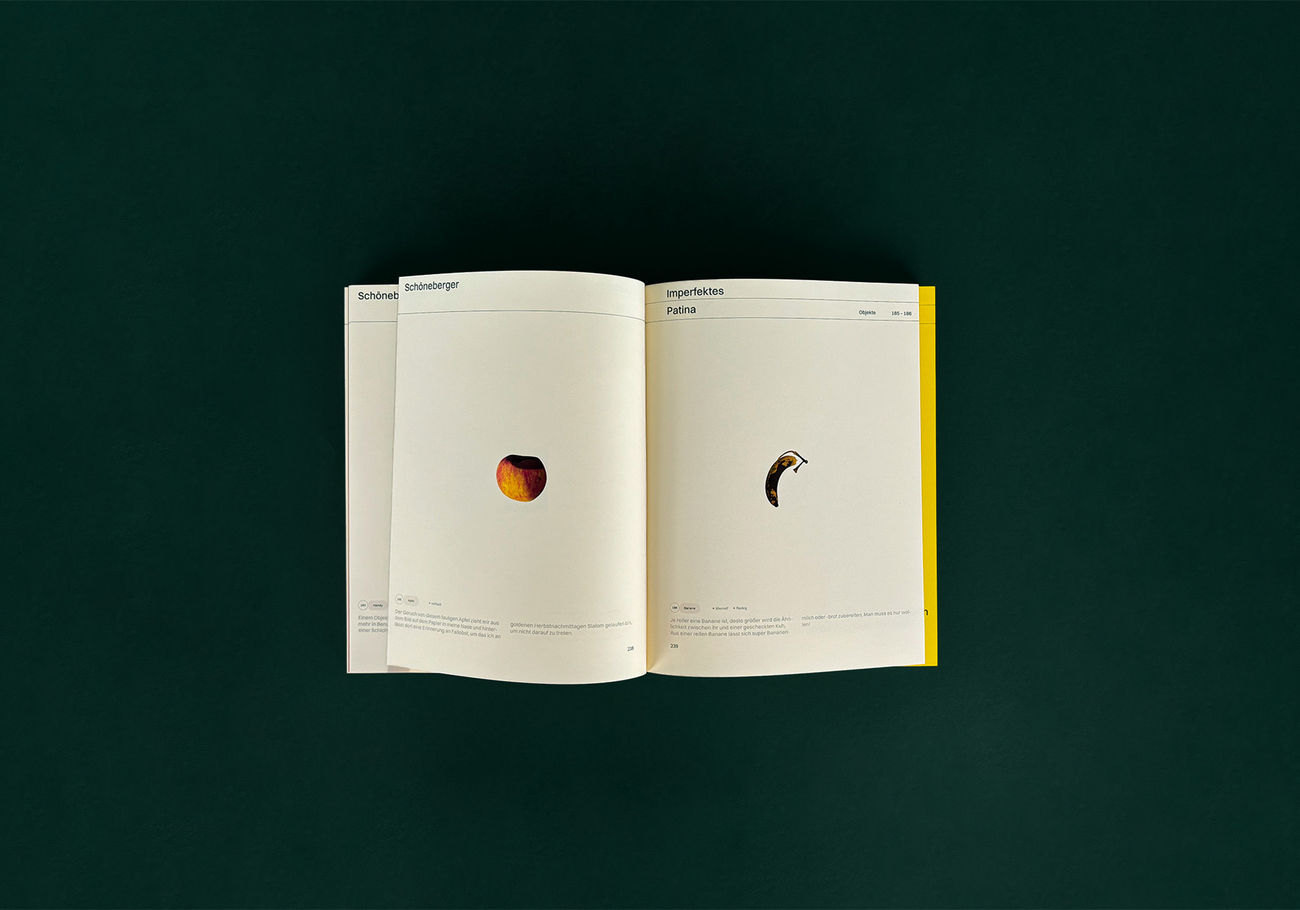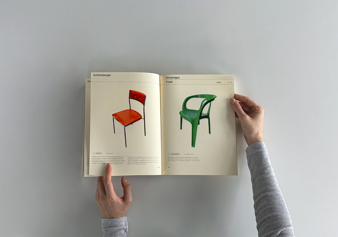 Das Werk „Schöneberger – Die Eigenartigkeit der Dinge“ befasst sich mit dem Begriff der Ästhetik abseits des klassisch Schönen: dem Schönen im Irritierenden, Fragwürdigen bis hin zur Entstehung von Anziehung.