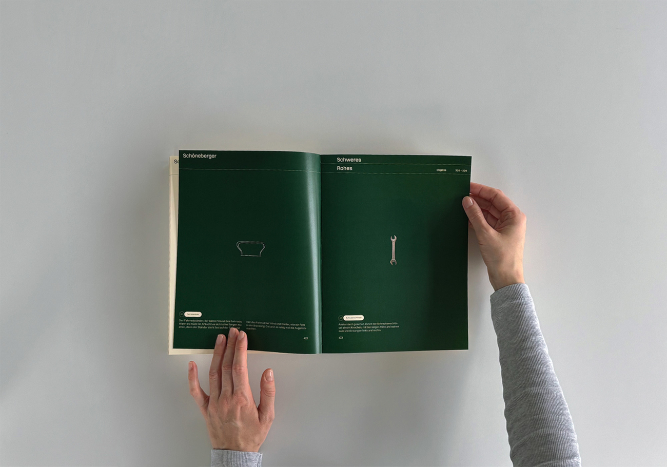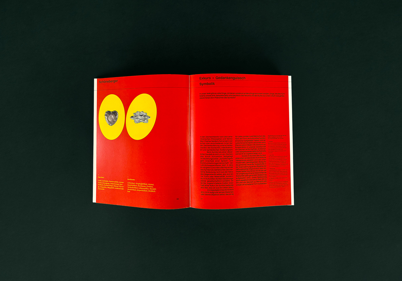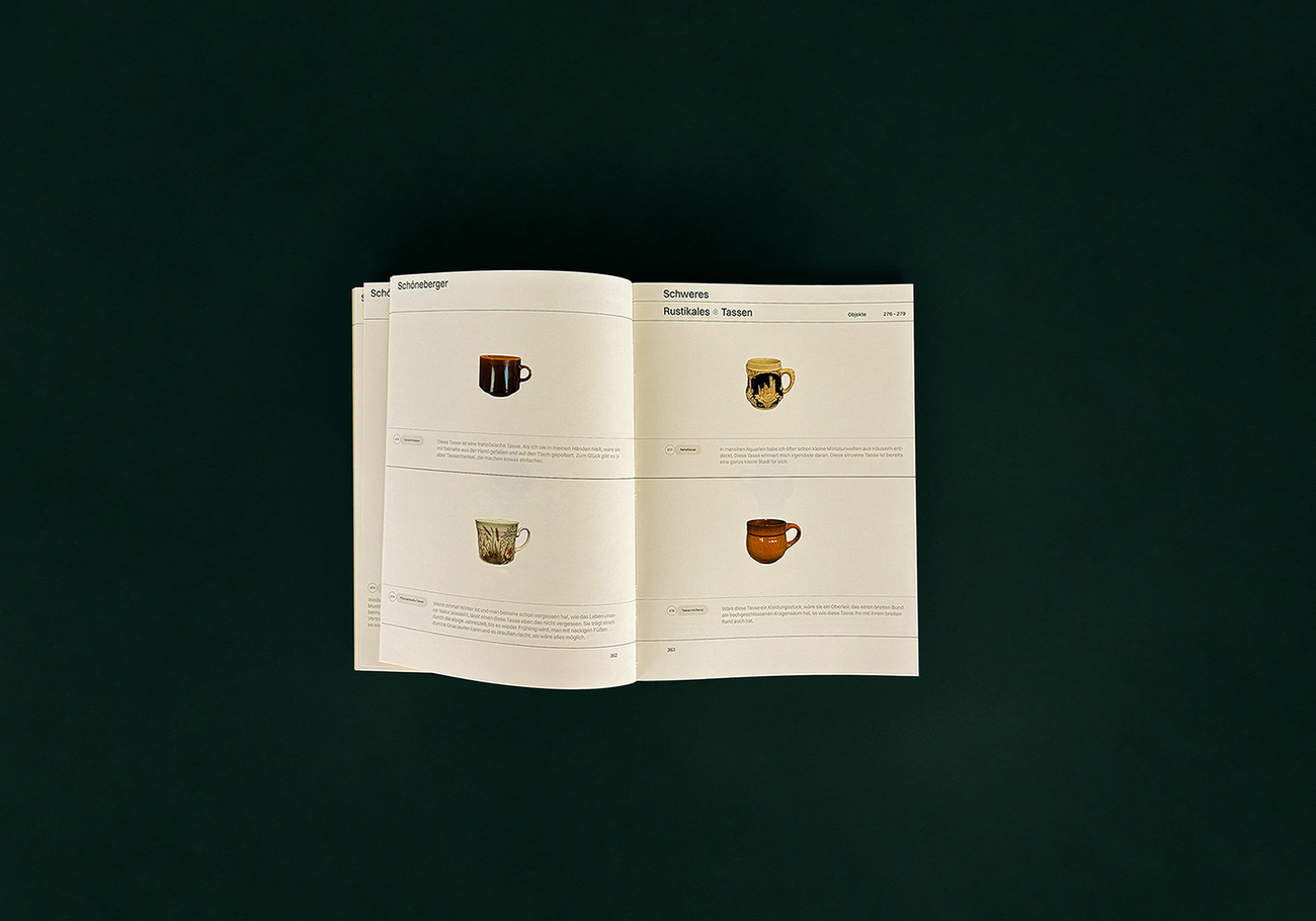Das Werk „Schöneberger – Die Eigenartigkeit der Dinge“ befasst sich mit dem Begriff der Ästhetik abseits des klassisch Schönen: dem Schönen im Irritierenden, Fragwürdigen bis hin zur Entstehung von Anziehung.