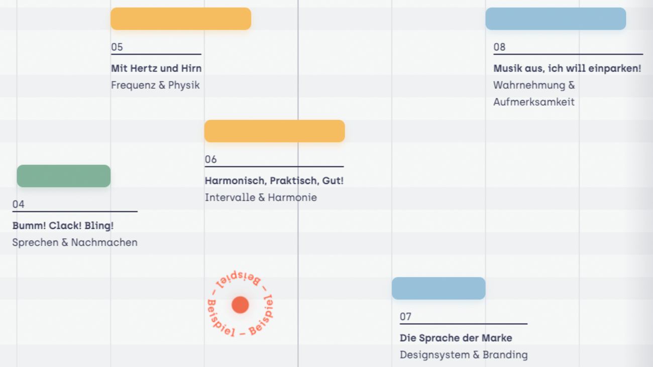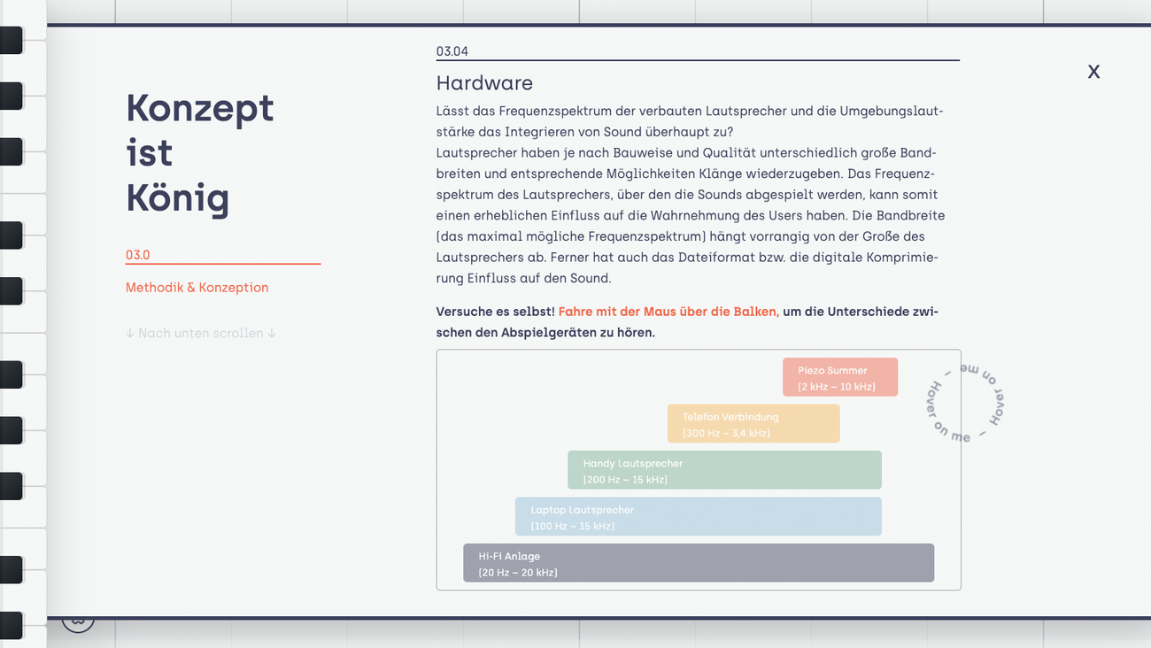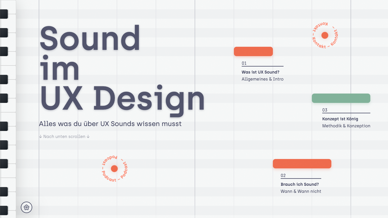 Der fachliche Inhalt wurde in verständlichen Texten aufbereitet und durch Illustrationen, Soundbeispiele, sowie interaktive Infografiken aufgelockert. Auf diese Weise bietet uxsound.de einen niederschwelligen Einstieg in ein komplexes Thema. Ein weiteres Standbein der Bachelorarbeit ist der Podcast „Sound Sache“ auf Spotify. Dieser erhöht die Reichweite der Plattform und informiert, sowie sensibilisiert noch mehr Designer für das Thema UX Sounds.