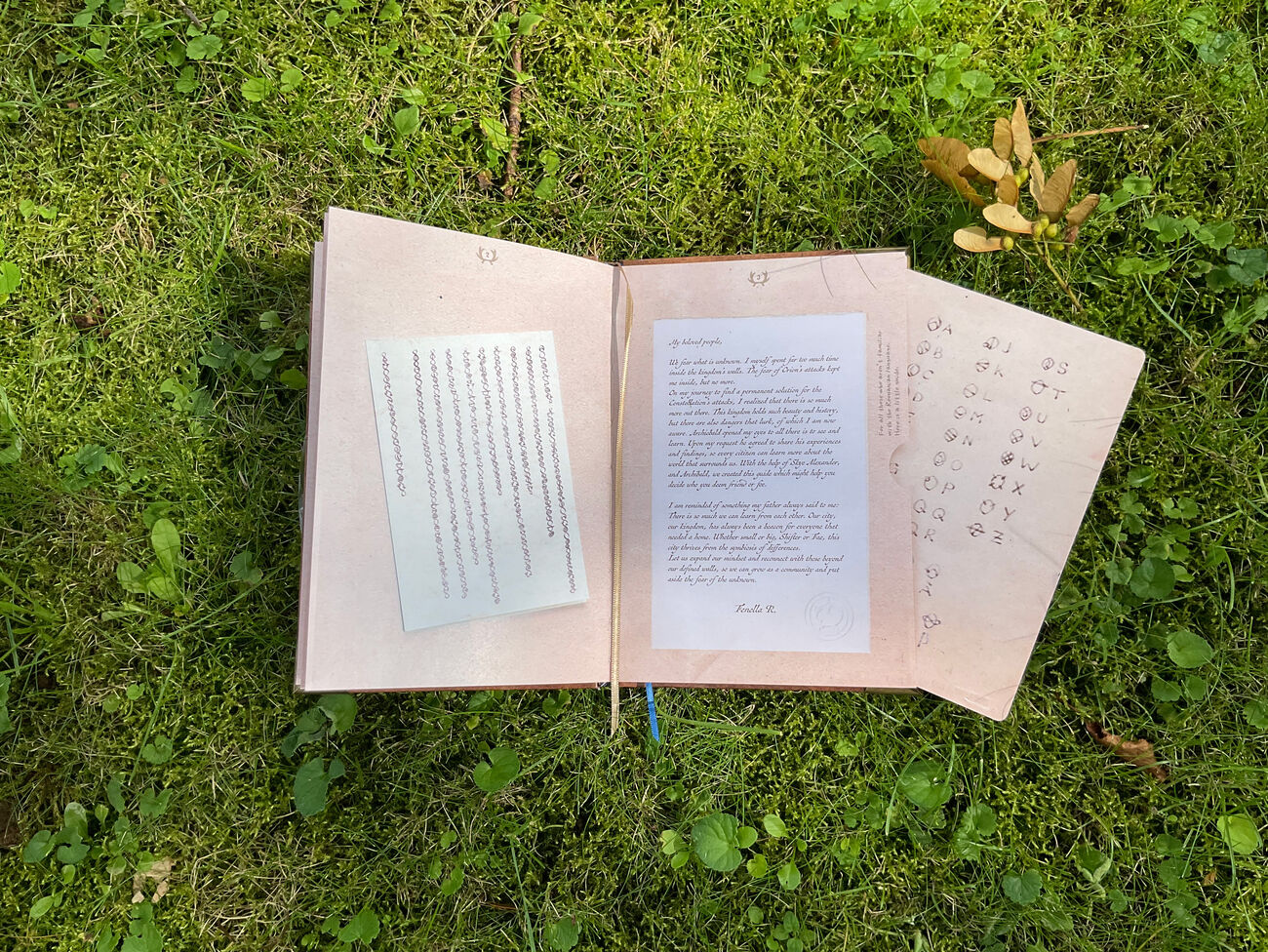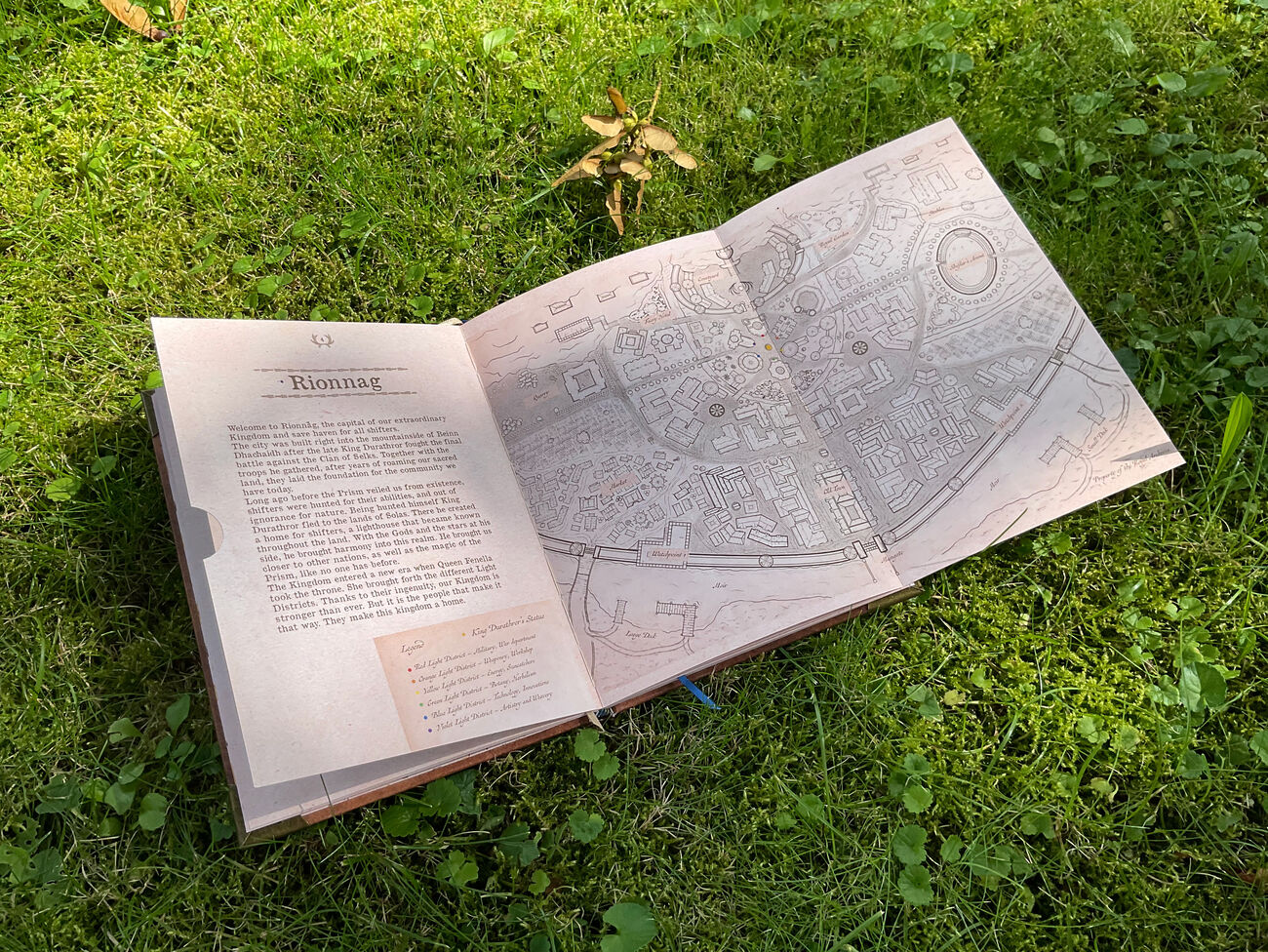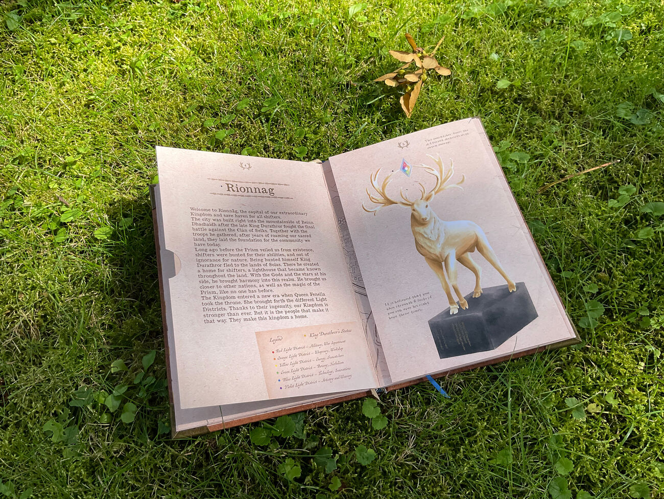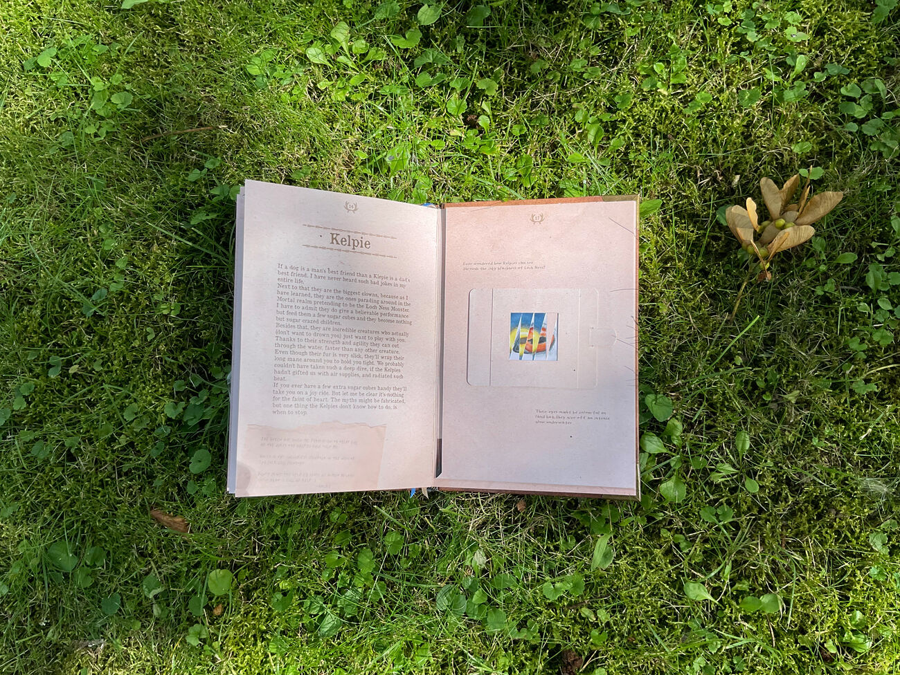 Die Bachelorarbeit selbst ist interaktiv gestaltet, damit die Welt nicht nur anschaulich, sondern auch erlebbar ist. Dadurch, dass ich dieses Buch selber gebunden habe, konnte ich verschiedene Klapp- und Schiebekarten einbinden, welche die Arbeit einzigartig und spielbar machen. Es versteckt sich auch ein echtes Stück Schottland darin.