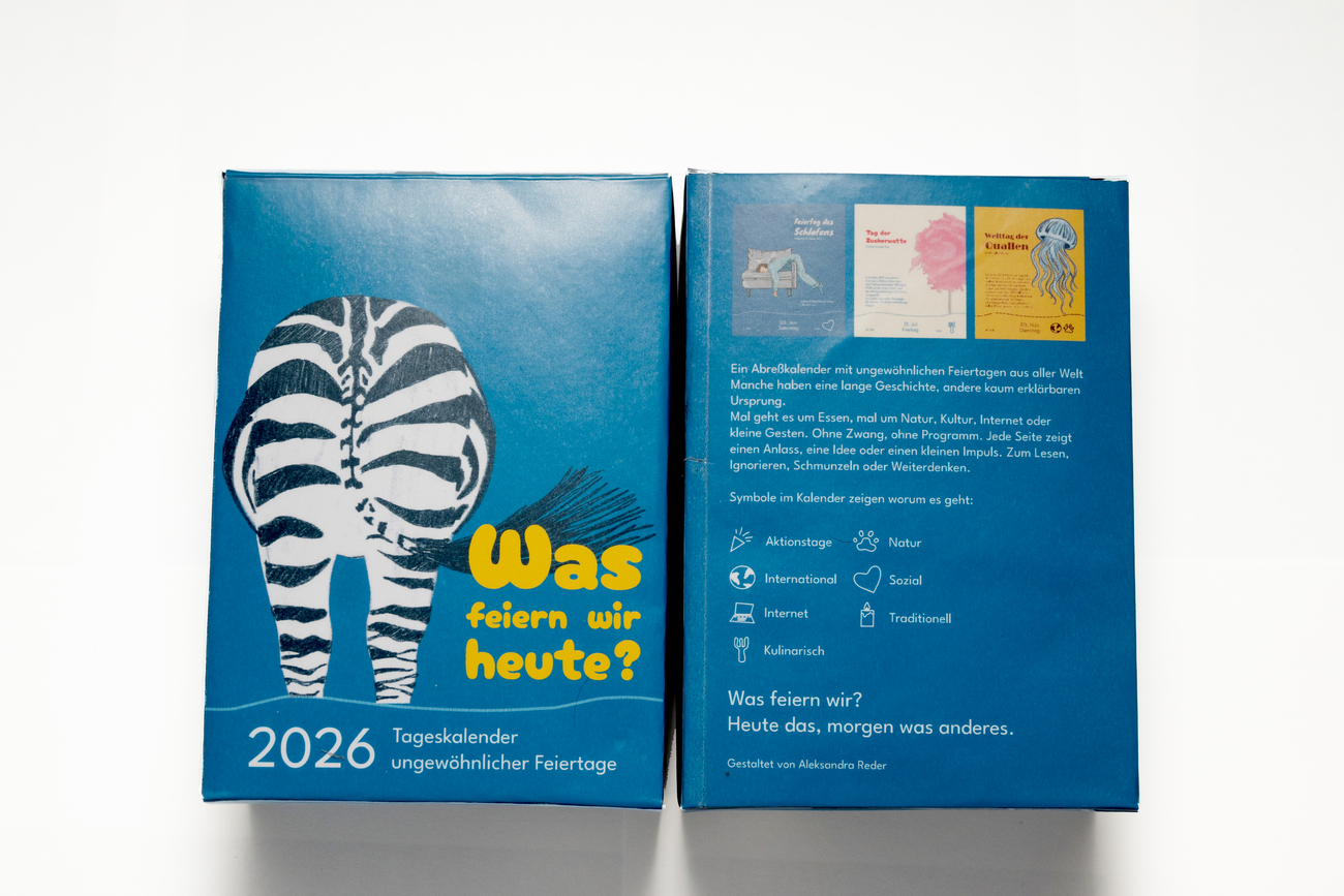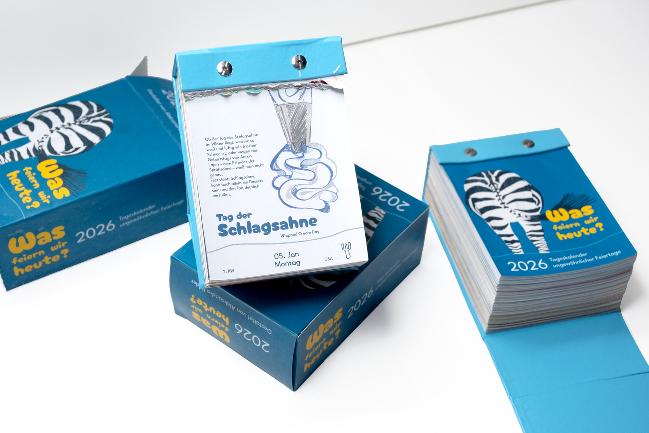 In meiner Bachelorarbeit „Was feiern wir heute? – Tageskalender ungewöhnlicher Feiertage“ habe ich mich mit inoffiziellen Feiertagen aus aller Welt beschäftigt. Der Abreißkalender widmet sich besonderen, absurden, ernsten oder spielerischen Anlässen, die jenseits der bekannten Feiertage liegen.