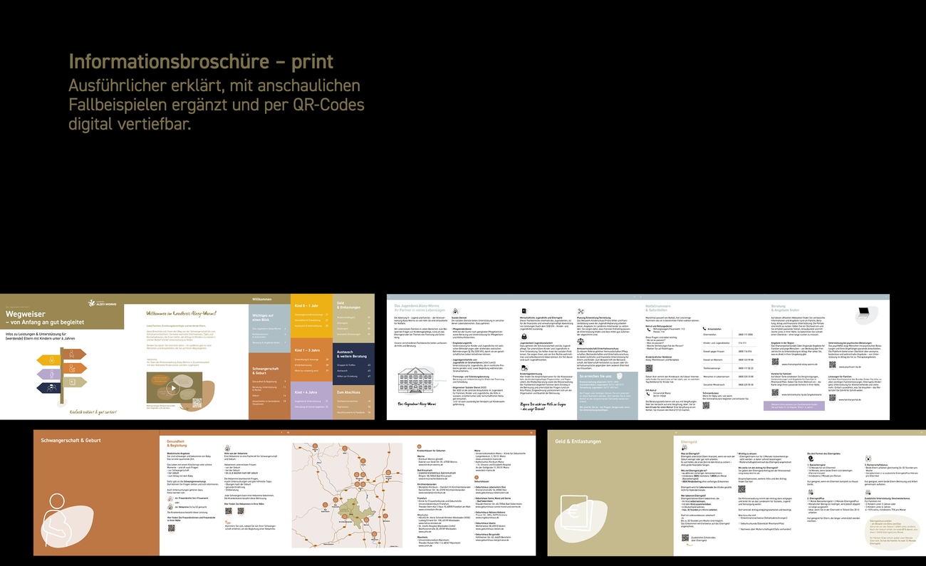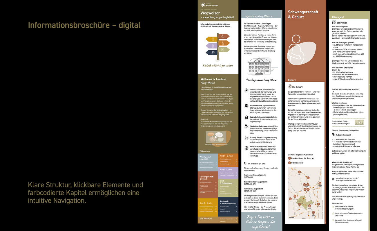 Als Ergebnis entstand der „Wegweiser – von Anfang an gut begleitet“: eine digitale Informationsbroschüre im Scroll-Format sowie eine ergänzende Printversion. Beide Formate führen Schritt für Schritt durch die relevanten Themen von Schwangerschaft bis Schulstart. Die Inhalte sind bewusst reduziert, leicht verständlich formuliert und entlang der Lebensphase gegliedert. Ein farbcodiertes Kapitelsystem und ein individuell entwickeltes Icon-Set unterstützen die Orientierung und ermöglichen schnellen Zugriff auf passende Angebote.