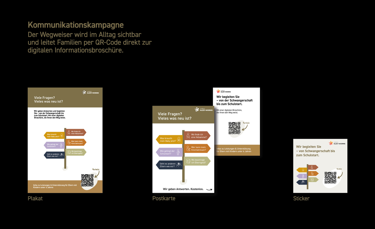 Damit das Angebot nicht nur verfügbar ist, sondern Familien tatsächlich erreicht, wurde zusätzlich eine Kommunikationskampagne entwickelt. Sticker, Postkarten und Plakate greifen typische Fragen aus dem Familienalltag auf und führen über QR-Codes direkt zur digitalen Broschüre. So entsteht ein System, das Orientierung nicht nur anbietet, sondern im Alltag sichtbar macht.