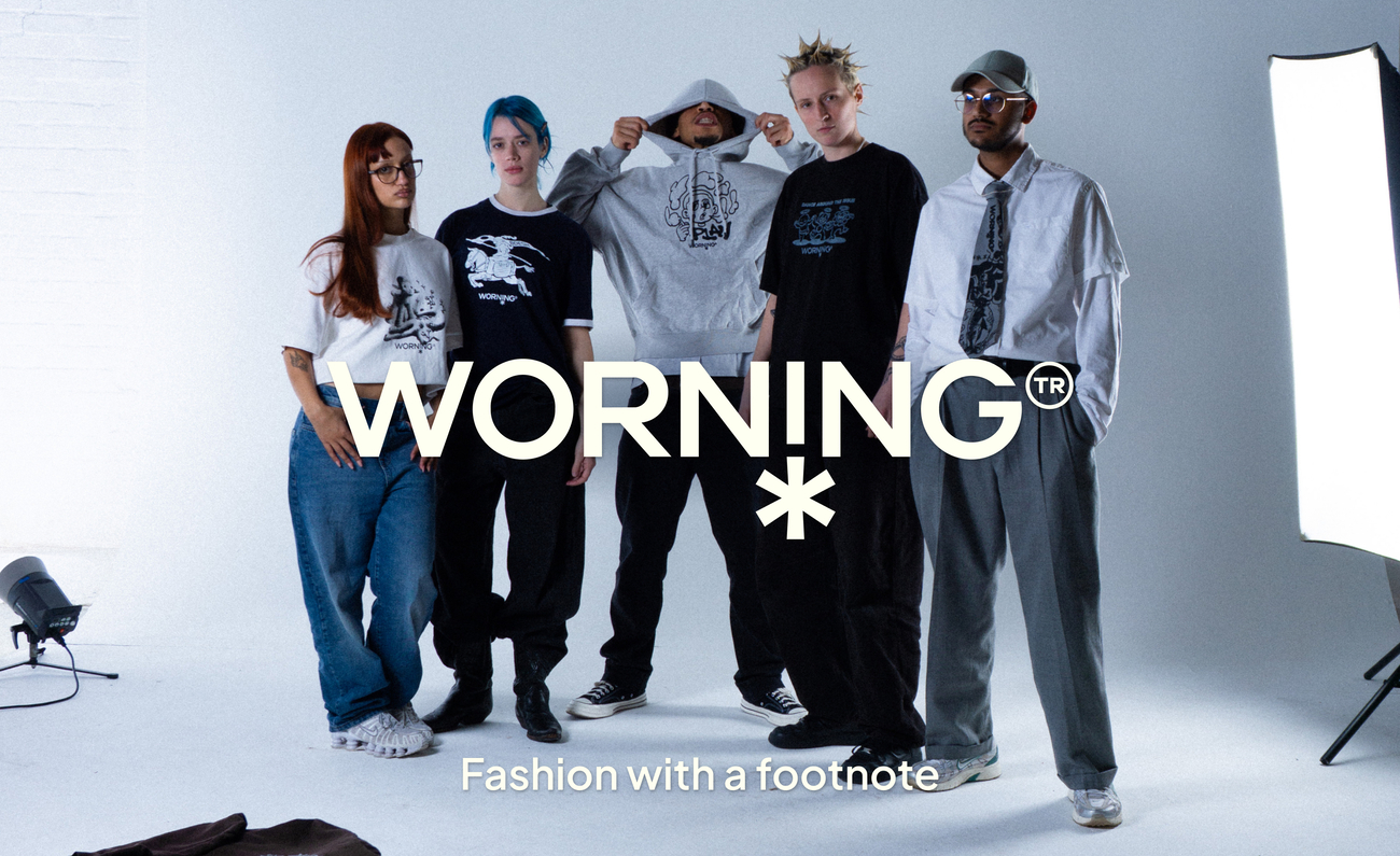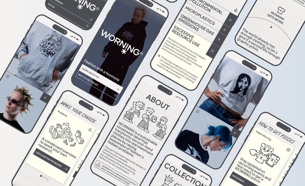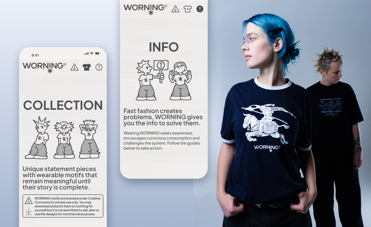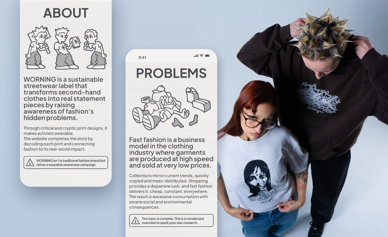 WORNING ist ein nachhaltiges Streetwear-Label, das gebrauchte Kleidung mit kritischen Motiven bedruckt und so auf die Missstände der Modeindustrie aufmerksam macht.