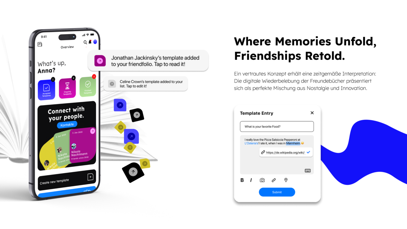 Friendfolio's Vision geht über die App hinaus. Die App erfasst den Charme der traditionellen Freundebücher, ermöglicht jedoch eine moderne, alltagstaugliche Nutzung für nahezu jedes Alter.