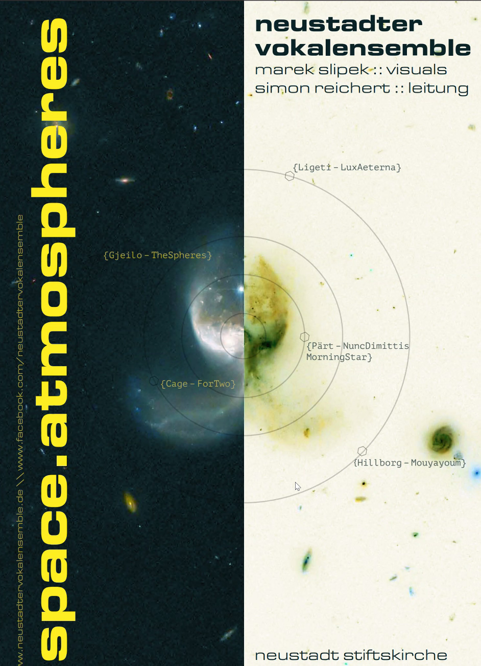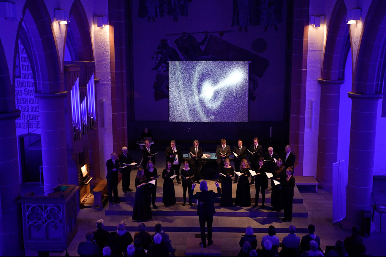 Zusammen mit dem Neustadter Vokal-Ensemble untersucht Marek Slipek, wie sich Klang interaktiv darstellen lässt. Thematisch an der Space Night ausgerichtet, hat er einen generativen Programmcode geschrieben, das Musiker:innen und Computervisualisierung verbindet.