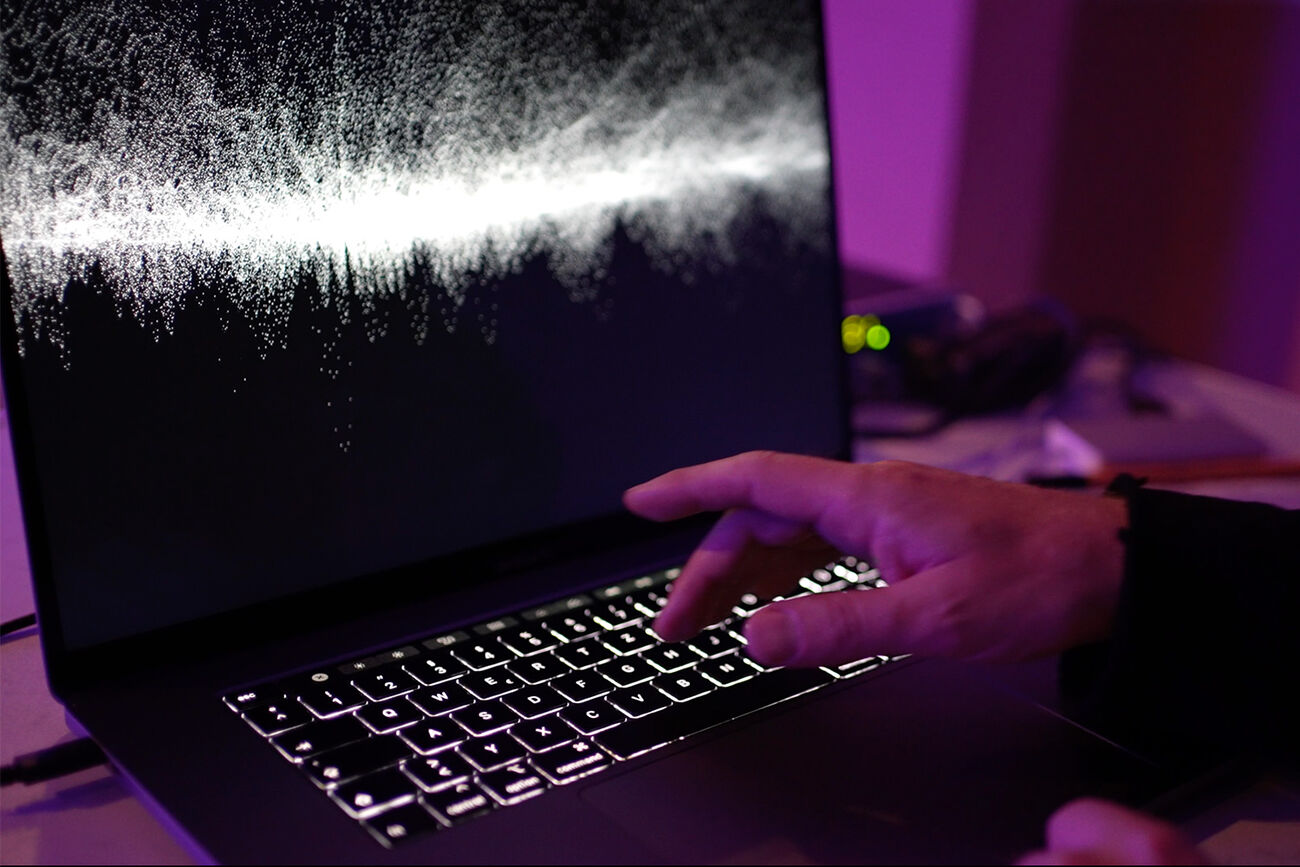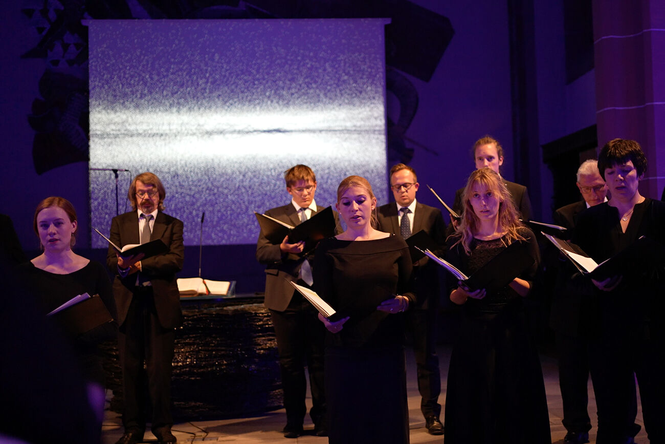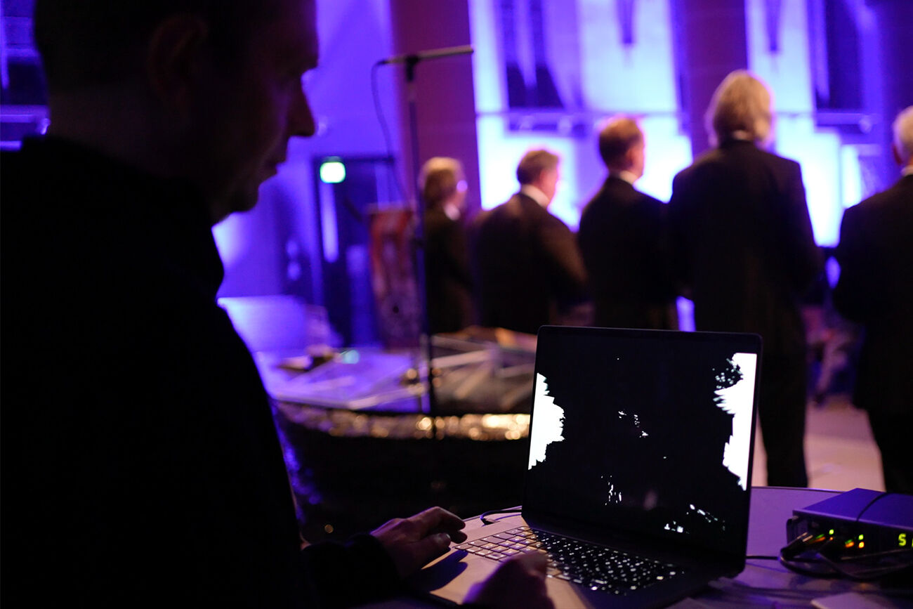 Über zwei Mikrofone beeinflussen Chorsänger:innen und Organist die rechnerbasierten Visuals. Während Musiker:innen performen, interpretieren hunderttausende in Echtzeit generierter Partikel visuell das akustische Geschehen.
